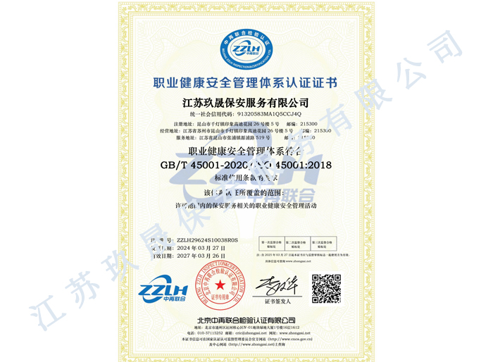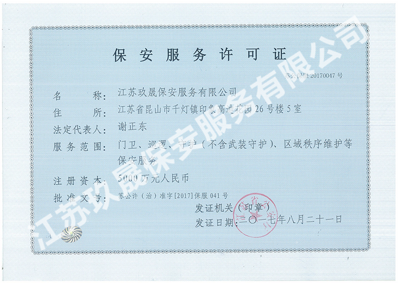 江蘇玖晟保安服務(wù)有限公司成立于江蘇省昆山市千燈鎮(zhèn)。注冊(cè)資金:5000萬(wàn),是擁有省公安廳頒發(fā)的保安服務(wù)許可證的企業(yè)【蘇公保服20170046】,也是昆山市保安協(xié)會(huì)常務(wù)理事單位。